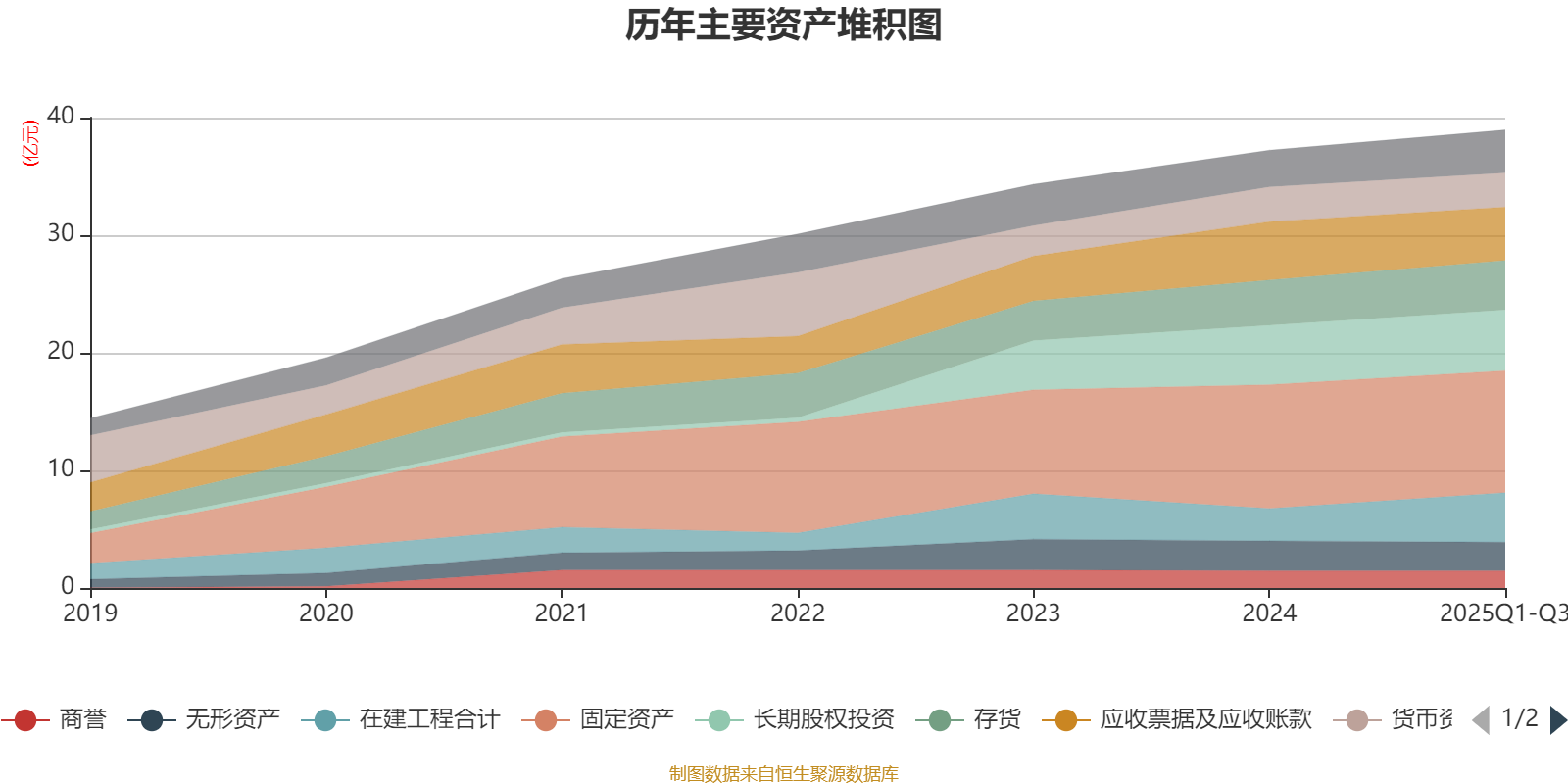 资产重大变化方面,截至2025年三季度末,公司在建工程合计较上年末增加53.1%,占公司总资产比重上升3.43个百分点;应收票据及应收账款较上年末减少8.75%,占公司总资产比重下降1.71个百分点;固定资产较上年末减少1.5%,占公司总资产比重下降1.66个百分点;其他非流动资产较上年末增加63.07%,占公司总资产比重上升0.73个百分点。