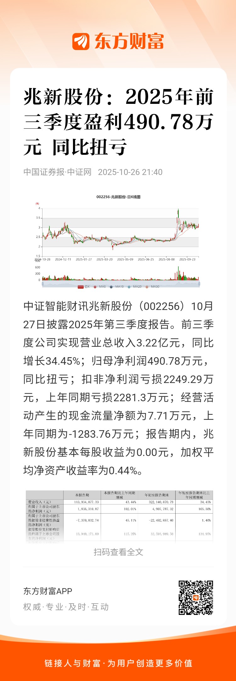 中证智能财讯兆新股份(002256)10月27日披露2025年第三季度报告。前三季度公司实现营业总收入3.22亿元,同比增长34.45%;归母净利润490.78万元,同比扭亏;扣非净利润亏损2249.29万元,上年同期亏损2281.3万元;经营活动产生的现金流量净额为7.71万元,上年同期为-1283.76万元;报告期内,兆新股份基本每股收益为0.00元,加权平均净资产收益率为0.44%。
