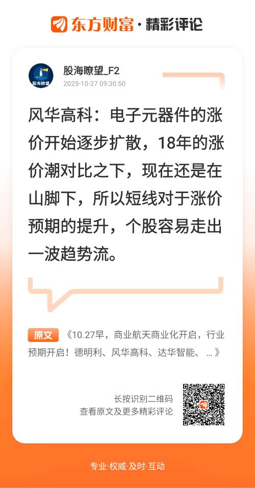 //@股海瞭望_F2 :风华高科:电子元器件的涨价开始逐步扩散,18年的涨价潮对比之下,现在还是在山脚下,所以短线对于涨价预期的提升,个股容易走出一波趋势流。