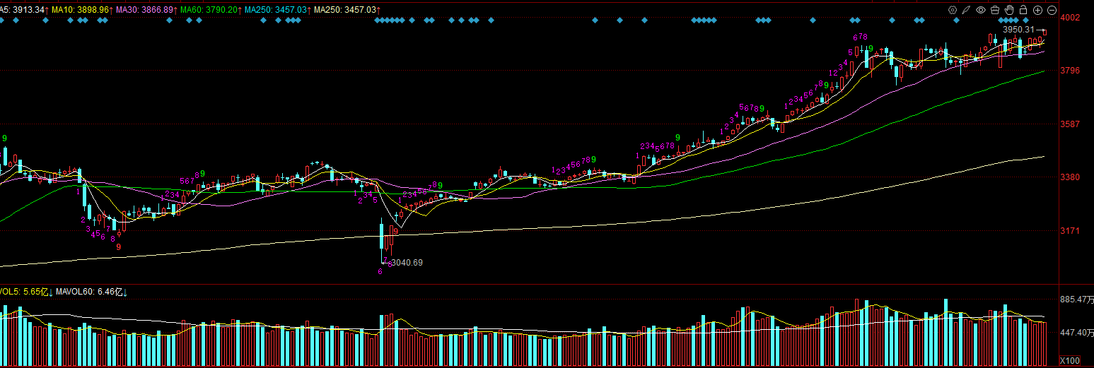 周末消息面上利好偏多,周一大盘先应该还会延续上攻走势的,上方压力位是3968点和3983点。成交量将还是关键。如果上攻能显著放量的话,那么大盘就可有效突破俩压力位而延续上攻走势的。而如果上攻无量的话,那么最迟周二将会回头并展开回踩确认走势的,那么下方的支撑位就是3937点和3929点。