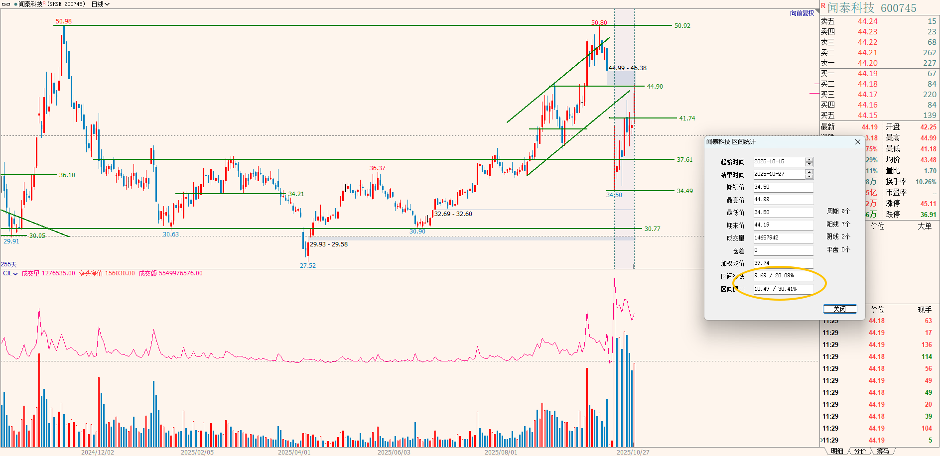 股价高开低走,接着拉升,当前大涨7个点,短线持仓者关注上方44.90的风控位。