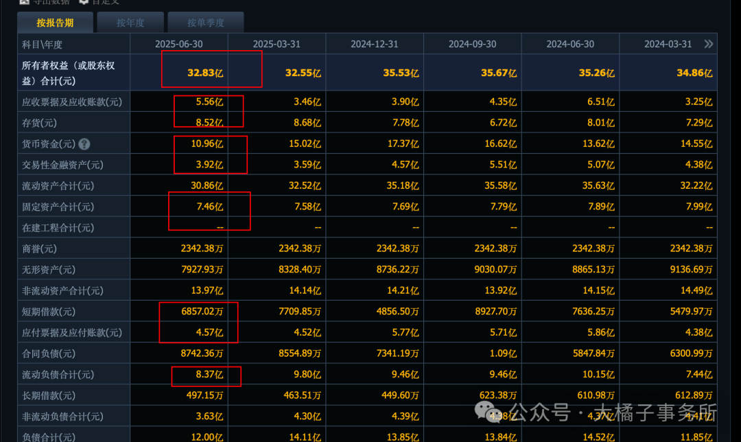 32 亿的权益:13 亿应收存货,15 亿现金,7 亿固定资产,5 亿短期借款和应付为主。