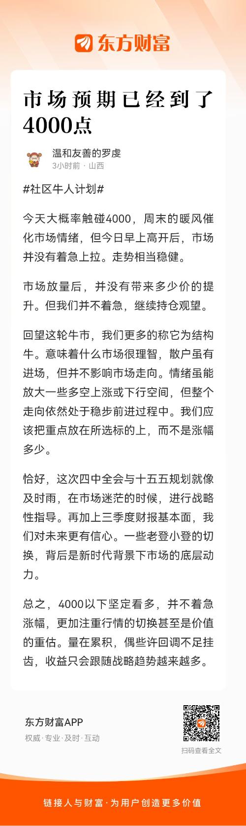 今天大概率触碰4000,周末的暖风催化市场情绪,但今日早上高开后,市场并没有着急上拉。走势相当稳健。