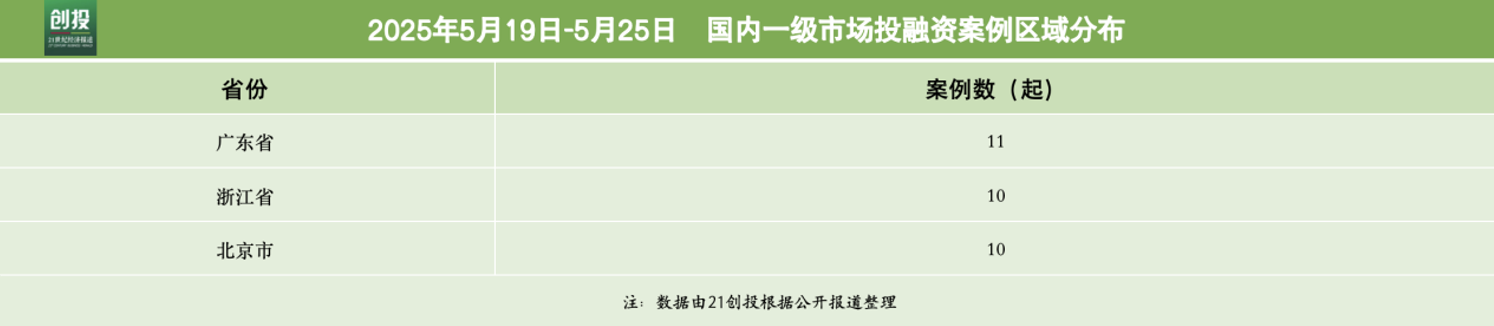 从披露获投企业的地域分布来看,本周的融资地区主要集中在广东省、浙江省和北京市。广东省完成11笔融资,浙江省和北京市各完成10笔融资。