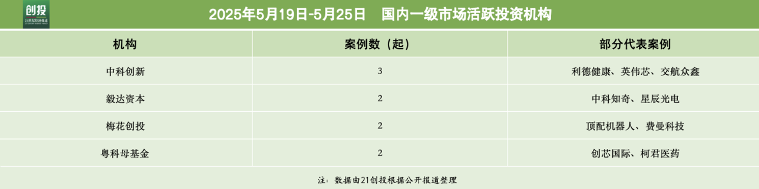 从机构投资活跃度来看,本周中科创新完成3笔融资,毅达资本、梅花创投和粤科母基金各完成2笔融资。