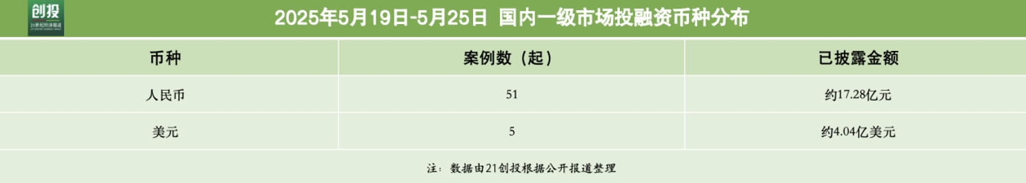 21创投不完全统计,5月19日—5月25日,报告日期内国内一级市场发生融资事件62起。其中,有56笔融资披露了融资金额和币种信息,总规模超人民币48.41亿元。