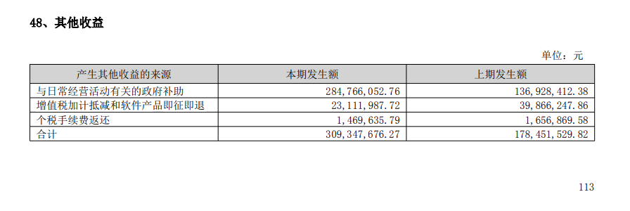 根据2025年中报披露,其他收益科目包括三部分:政府补助、增值税加计抵减和软件产品即征即退、个税手续费返还,其中政府补助占到九成以上。