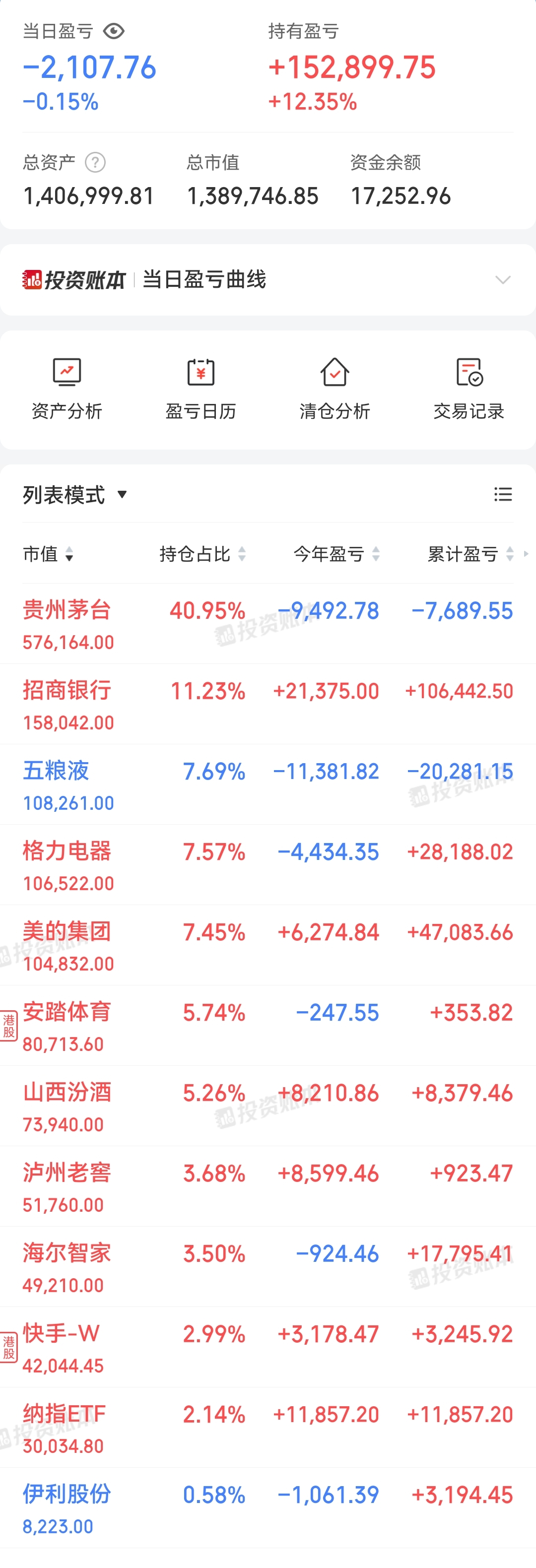 贵州茅台、招商银行、美的集团、格力电器、五粮液、山西汾酒、泸州老窖、安踏体育、海尔智家、快手、伊利股份、纳指ETF159941。