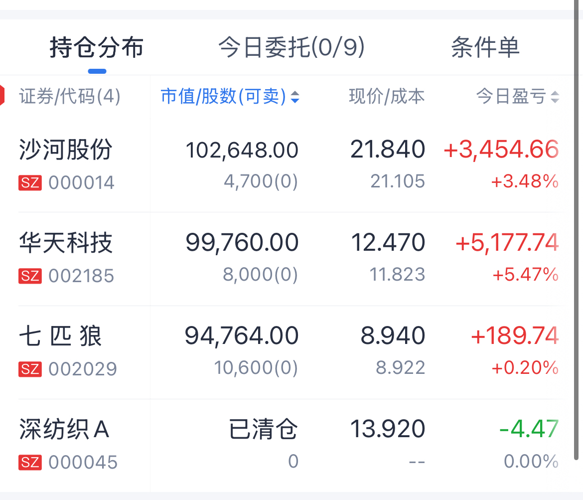 #收盘点评# 早盘深纺织没卖好,小亏一点,后三成仓低吸沙河股份,又低吸华天科技,本想8.88低吸(昨日低点)七匹狼,心急了8.92建仓,目前小赚,等待拉升