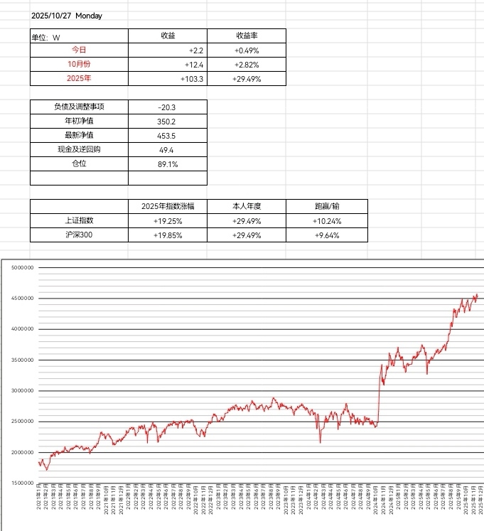 2025.10.27周一今日+2.2w(+0.49%)2025年+103.3w(