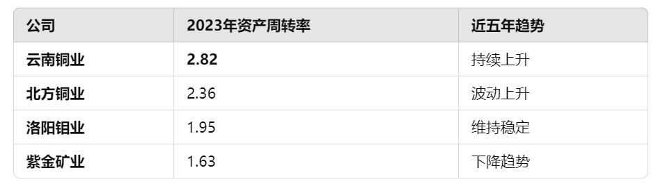 结论:云南铜业的资产周转率最高,资金流转效率最优,但净利率偏低,属于薄利多销模式;紫金矿业虽然周转率下降,但凭借高净利率仍然赚钱。