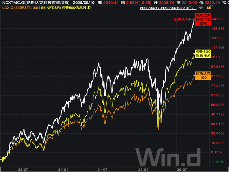 我们知道,美股里面最强的就是科技股,在科技股占优的行情下,纳斯达克科技市值加权指数业绩就明显优于纳斯达克100指数