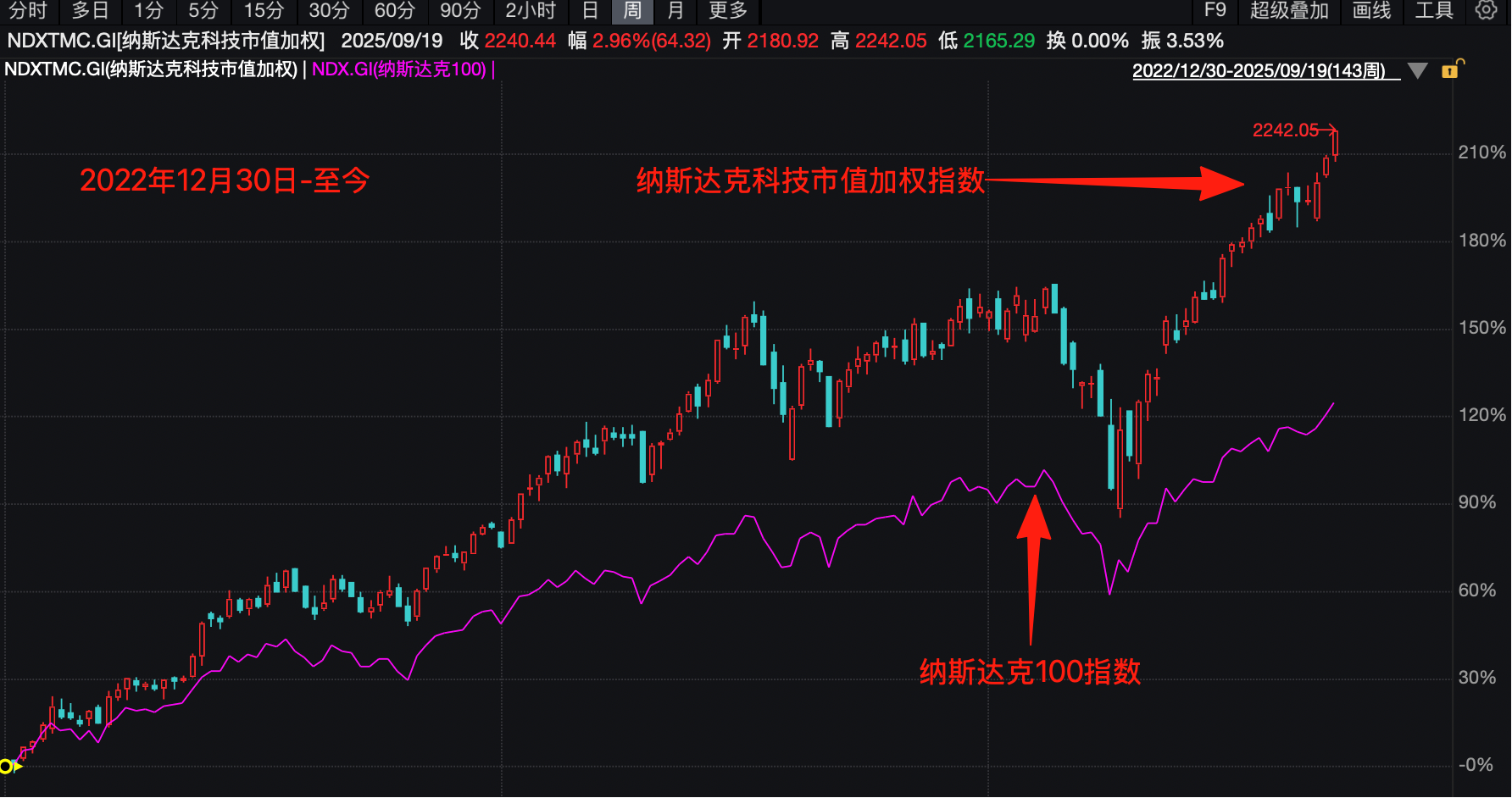 下面是纳斯达克科技市值加权指数从2022年年底至今和纳斯达克100指数的走势对比,将近多了100%的涨幅