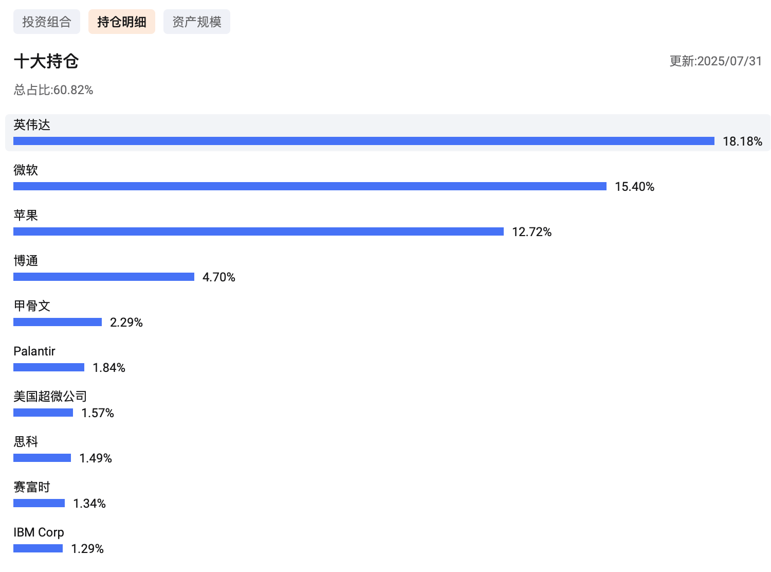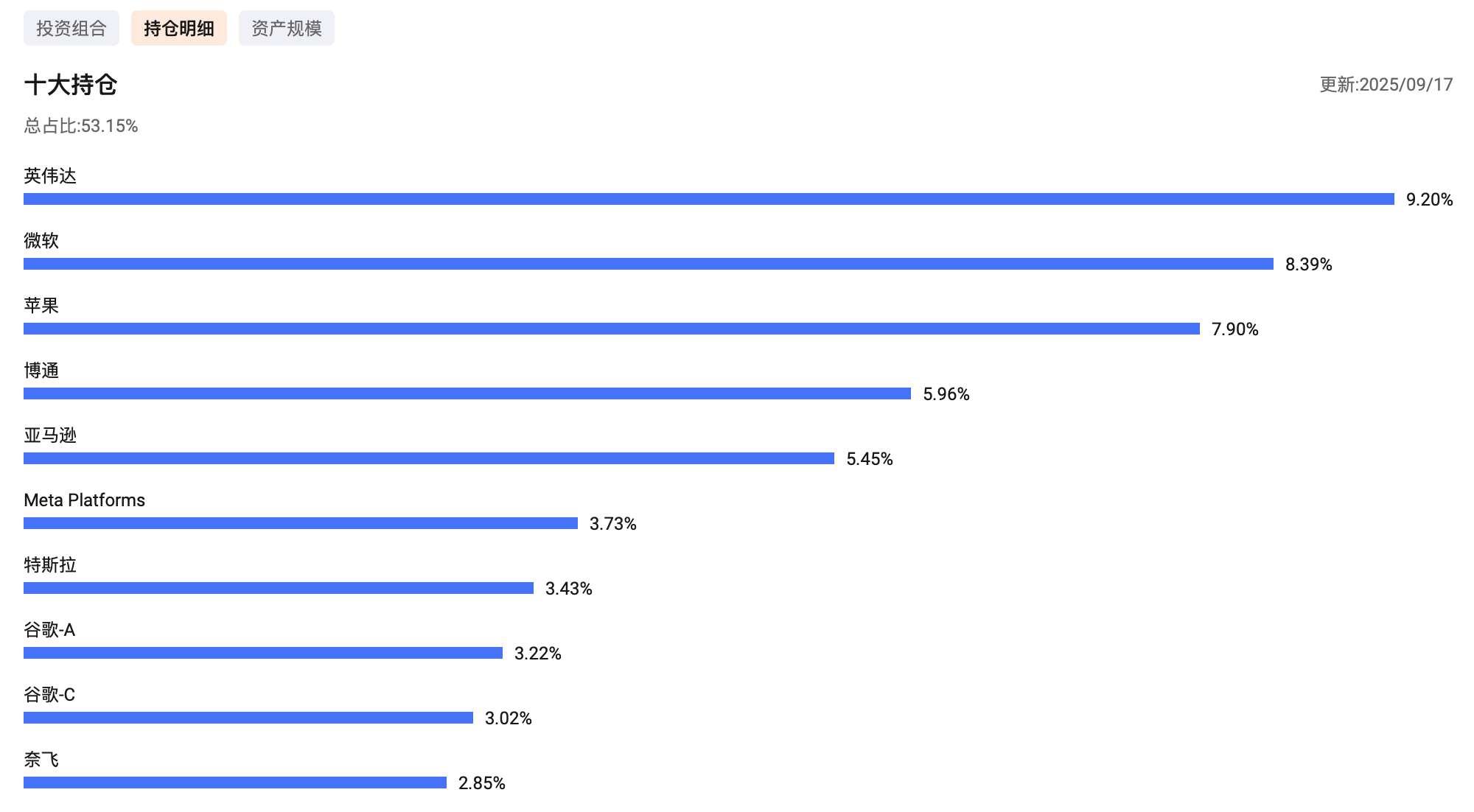 前十大重仓股涵盖了科技七巨头(英伟达、微软、苹果、谷歌、亚马逊、meta、特斯拉)以及博通、奈飞