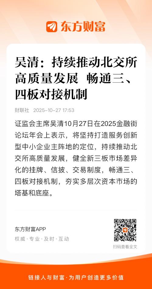 证监会主席吴清10月27日在2025金融街论坛年会上表示,将坚持打造服务创新型中小企业主阵地的定位,持续推动北交所高质量发展,健全新三板市场差异化的挂牌、信披、交易制度,畅通三、四板对接机制,夯实多层次资本市场的塔基和底座。