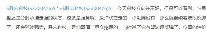 胜宏科技300476:它今日继续走强的大阳线,近期走的简直是太强势了,非常舒服啊。上周在文里连续讲了,它还会有波段反弹行情,这不是马后吧,可以回看文章。根上的很舒服了吧。胜宏科技,是坤哥上周二早文挖掘的,当时说了它有望开启波段反弹了,位置的性价比优势已经出来了。当时分析还是非常明确的,坤哥从来都是讲在前头的。可以看到,上周二当日就反转大阳线,如期开启波段反弹,之后几天也是连续走强。