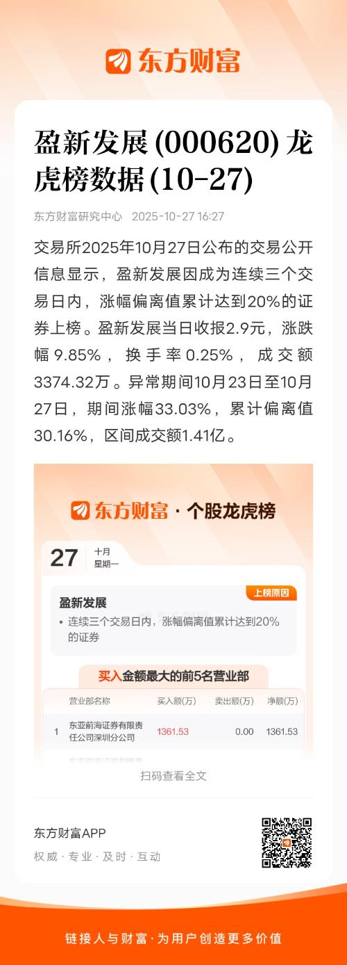 交易所2025年10月27日公布的交易公开信息显示,盈新发展因成为连续三个交易日内,涨幅偏离值累计达到20%的证券上榜。盈新发展当日收报2.9元,涨跌幅9.85%,换手率0.25%,成交额3374.32万。异常期间10月23日至10月27日,期间涨幅33.03%,累计偏离值30.16%,区间成交额1.41亿。