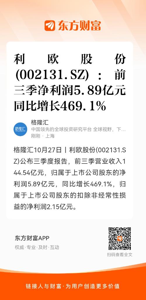 格隆汇10月27日丨利欧股份(002131.SZ)公布三季度报告,前三季营业收入144.54亿元,归属于上市公司股东的净利润5.89亿元,同比增长469.1%,归属于上市公司股东的扣除非经常性损益的净利润2.15亿元。