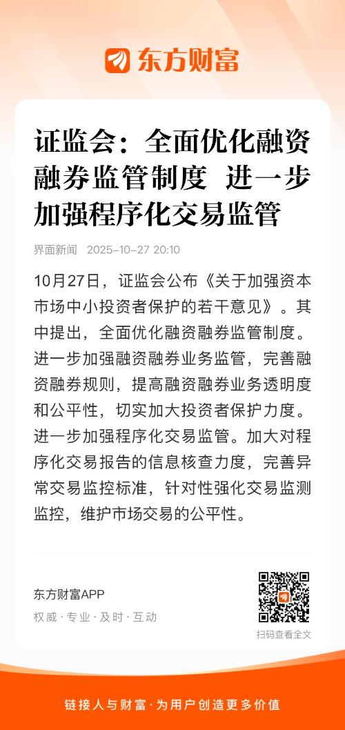 10月27日,证监会公布《关于加强资本市场中小投资者保护的若干意见》。其中提出,全面优化融资融券监管制度。进一步加强融资融券业务监管,完善融资融券规则,提高融资融券业务透明度和公平性,切实加大投资者保护力度。进一步加强程序化交易监管。加大对程序化交易报告的信息核查力度,完善异常交易监控标准,针对性强化交易监测监控,维护市场交易的公平性。