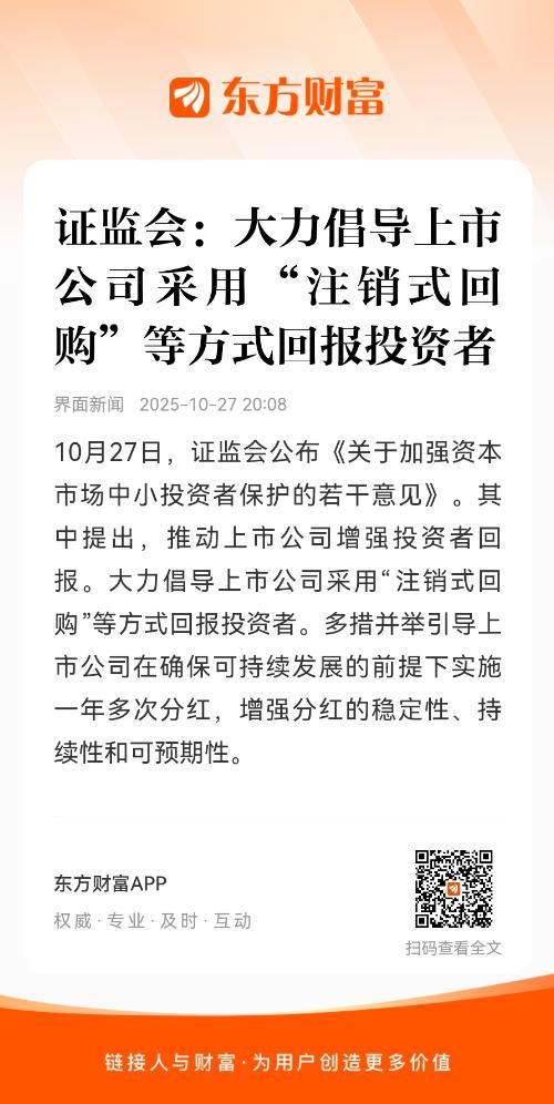 10月27日,证监会公布《关于加强资本市场中小投资者保护的若干意见》。其中提出,推动上市公司增强投资者回报。大力倡导上市公司采用“注销式回购”等方式回报投资者。多措并举引导上市公司在确保可持续发展的前提下实施一年多次分红,增强分红的稳定性、持续性和可预期性。