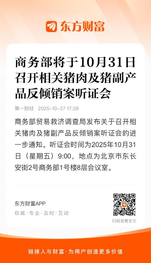 商务部贸易救济调查局发布关于召开相关猪肉及猪副产品反倾销案听证会的进一步通知。听证会时间为2025年10月31日(星期五)9:00,地点为北京市东长安街2号商务部1号楼8层会议室。本次听证会的内容为相关猪肉及猪副产品反倾销案初步裁定中的倾销、损害及二者之间因果关系有关事项,除此以外的其他事项不作为本次听证会的听证内容。