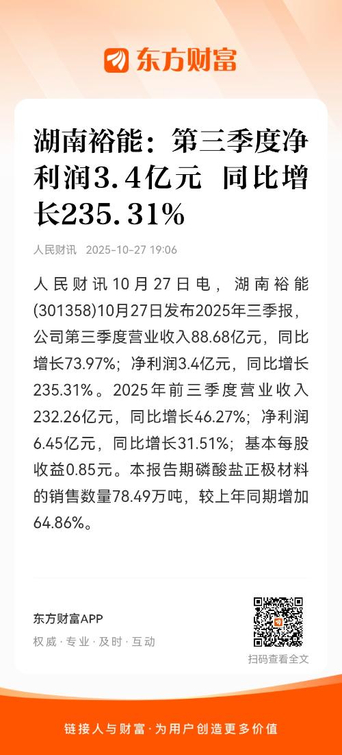 人民财讯10月27日电,湖南裕能(301358)10月27日发布2025年三季报,公司第三季度营业收入88.68亿元,同比增长73.97%;净利润3.4亿元,同比增长235.31%。2025年前三季度营业收入232.26亿元,同比增长46.27%;净利润6.45亿元,同比增长31.51%;基本每股收益0.85元。本报告期磷酸盐正极材料的销售数量78.49万吨,较上年同期增加64.86%。