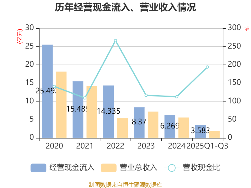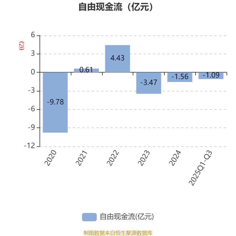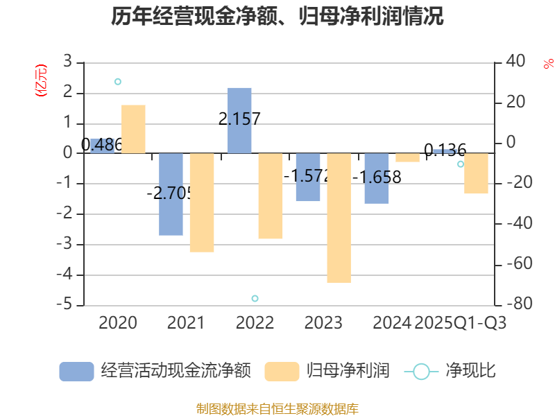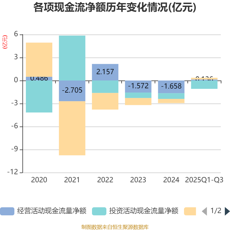 2025年前三季度,公司经营活动现金流净额为1359.16万元,同比增加1.01亿元;筹资活动现金流净额2176.32万元,同比增加5042.17万元;投资活动现金流净额-1.09亿元,上年同期为-6696.42万元。