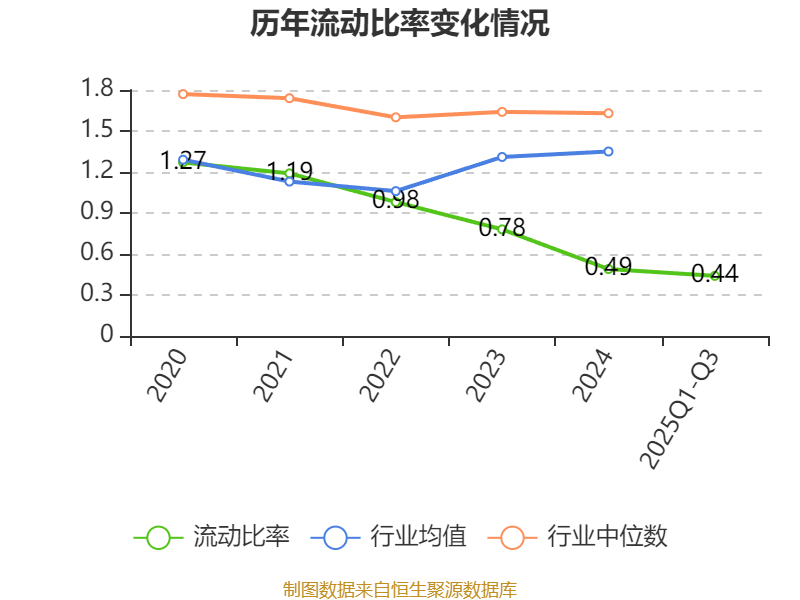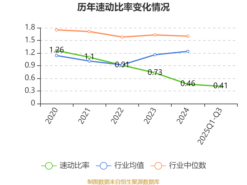 2025年前三季度,公司流动比率为0.44,速动比率为0.41。