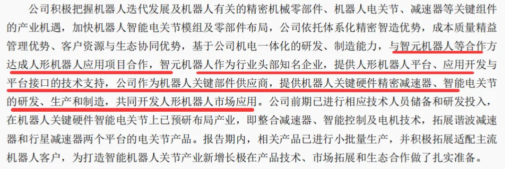 2024年10月,与智元达成框架协议,拟组建合资公司布局人形机器人。凭借在精密零件制造、机电一体化等方面的技术优势,提供机器人关键硬件精密减速器、智能电关节的研发生产制造。今年8月11日,智元宣布与公司达成数千万元项目合作,近百台远征A2-W将落地富临精工工厂,这也是国内首个工业领域具身机器人规模化商业签单。