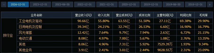 业务结构上:工业电机占比66%,用于水泵、风机、压缩机、采矿、冶金、油气等领域。日用电机24%,用于暖通空调、洗衣机、冰箱、小家电及电动工具等领域。电动交通占比5%,为新能源车驱动电机、电助力车驱动系统、电动航空电机等。