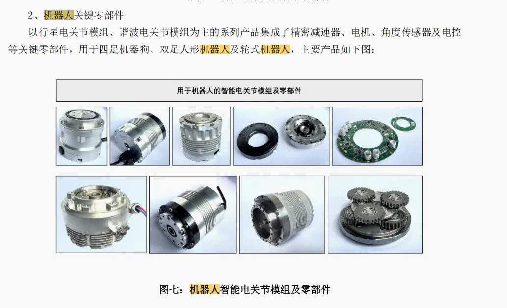 机器人产业是汽车精密制造零部件的延伸,主要进行了机器人电关节模组产业布局。产品包括行星电关节模组、谐波电关节模组为主的系列产品,集成了精密减速器、电机、角度传感器及电控等关键零部件。用于四足机器狗、双足人形机器人及轮式机器人。