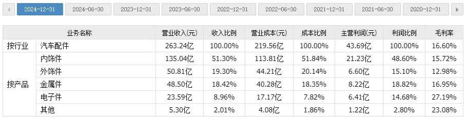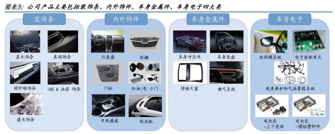 业务结构上,内饰件占比51%,外饰件19%,金属件18%,电子件9%。具体产品包含仪表、中控、门板等多种内饰件;格栅、加油,充电口盖等外饰件;电池包壳体、热成型件等金属件;后视镜模块系统、高压防护塑料组件等电子件,以及储能模组塑料件等新能源产品。