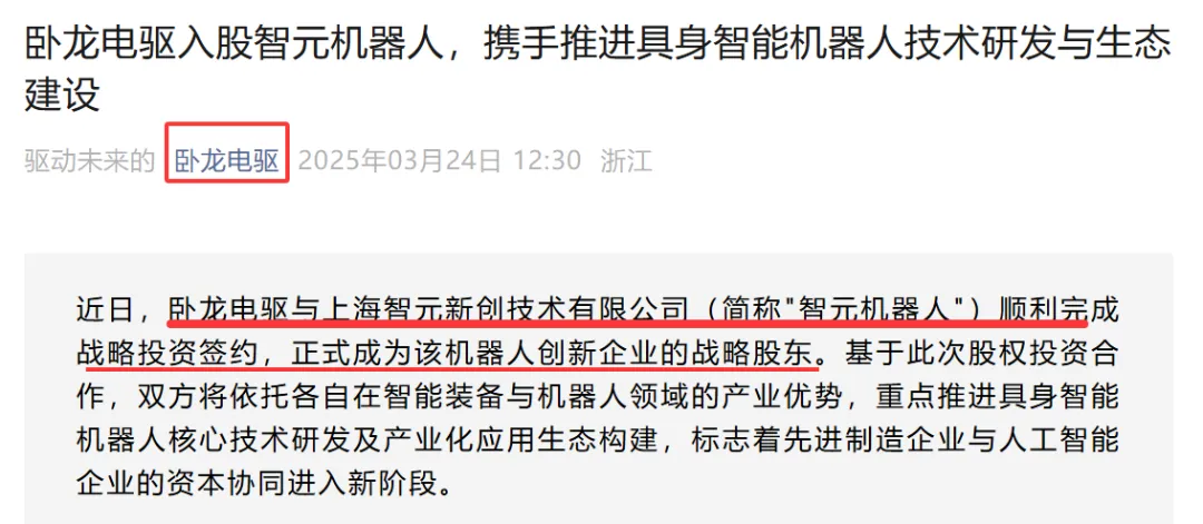 在机器人领域,开发了高爆发关节模组、伺服驱动器、无框力矩电机,及实心关节模组等关键部件,部分已获小批量订单。并在今年3月与智元达成双向持股,智元机器人以增资扩股的形式,对卧龙子公司希尔机器人进行战略注资。同时卧龙持有智元机器人约0.76%的股权,双方将在机器人诸多方面展开合作。