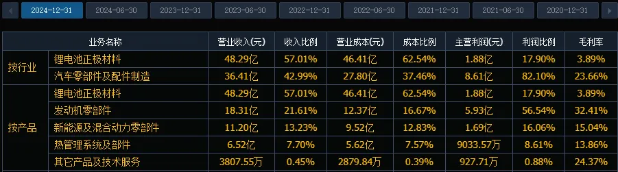 业务结构上,锂电正极和汽车零部件,分别占比57%和43%。正极主要是磷酸铁锂,侧重于高压密磷酸铁锂快充产品。宁德是核心客户,2024年采购占比超九成。