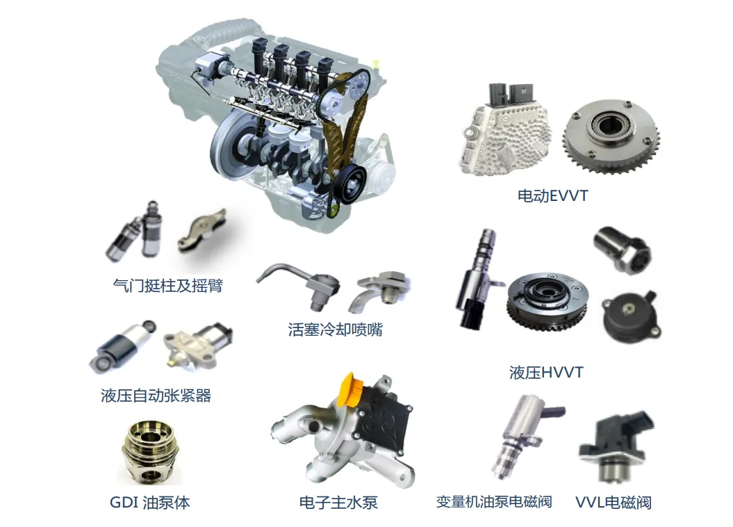 汽零产品包括挺柱、摇臂等汽车发动机及变速箱精密零部件,电子水泵、智能热管理集成模块等,用于汽车发动机、热管理及动力系统等。客户涵盖上汽、比亚迪、华为、吉利、理想、小鹏等。
