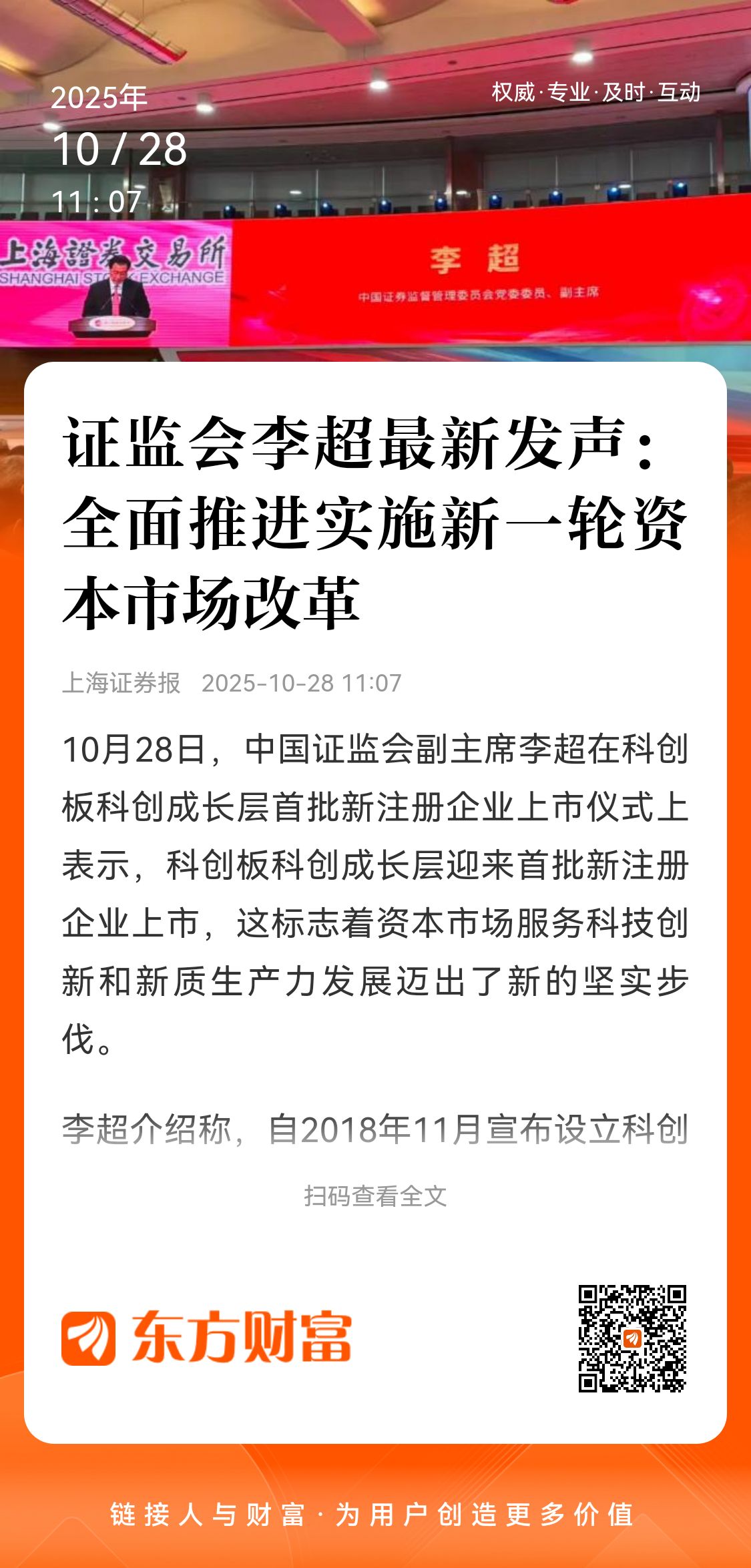 10月28日,中国证监会副主席李超在科创板科创成长层首批新注册企业上市仪式上表示,科创板科创成长层迎来首批新注册企业上市,这标志着资本市场服务科技创新和新质生产力发展迈出了新的坚实步伐。