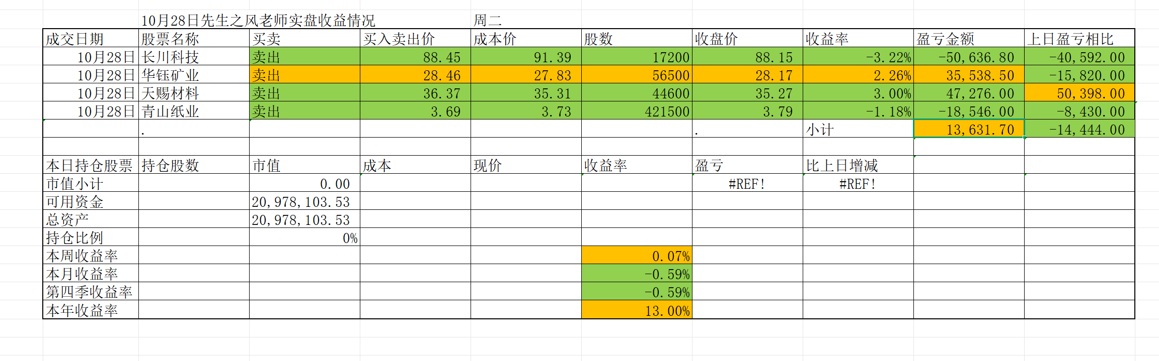 【10月28日先生组合实战复盘】回撤近半集合竞价果然差强人意,全部卖出后利润回撤