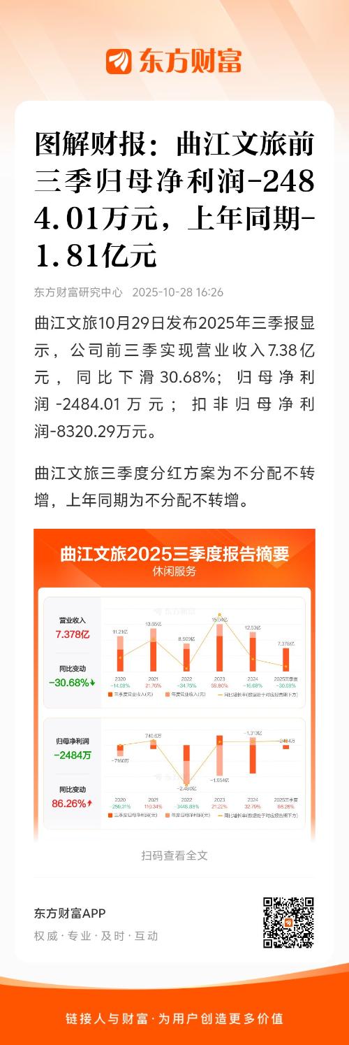 曲江文旅10月29日发布2025年三季报显示,公司前三季实现营业收入7.38亿元,同比下滑30.68%;归母净利润-2484.01万元;扣非归母净利润-8320.29万元。