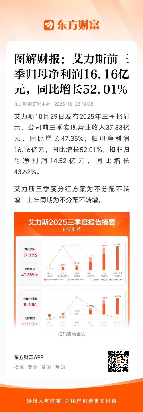 艾力斯10月29日发布2025年三季报显示,公司前三季实现营业收入37.33亿元,同比增长47.35%;归母净利润16.16亿元,同比增长52.01%;扣非归母净利润14.52亿元,同比增长43.62%。