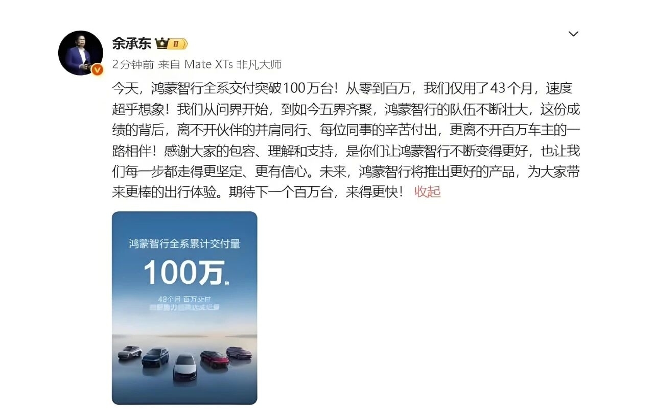 $赛力斯(HK|09927)$ $赛力斯(SH601127)$ 电动化时代,比亚迪打不赢BBA保时捷路虎。智能化时代,鸿蒙智行打赢了BBA保时捷路虎。鸿蒙智行保有量突破100万,从零到100万辆是最困难的,从100万到1000万辆是最容易的!!!