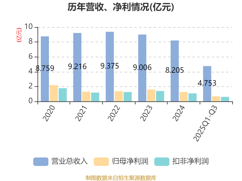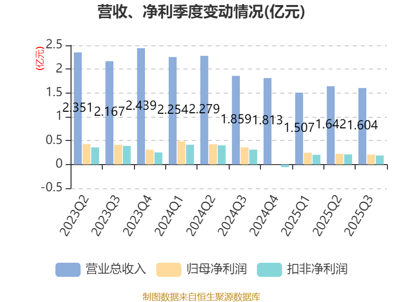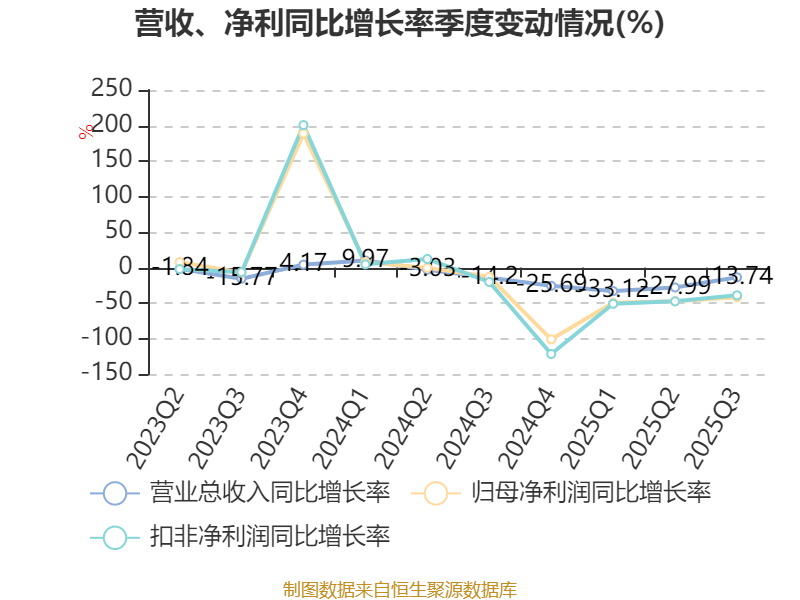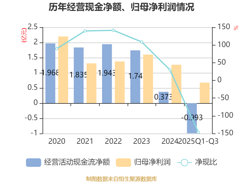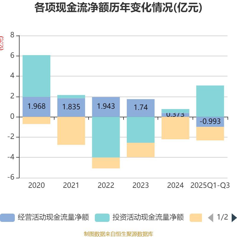 2025年前三季度,公司经营活动现金流净额为-9931.28万元,同比减少1.36亿元;筹资活动现金流净额-1.33亿元,同比增加8663.1万元;投资活动现金流净额3.08亿元,上年同期为1.22亿元。