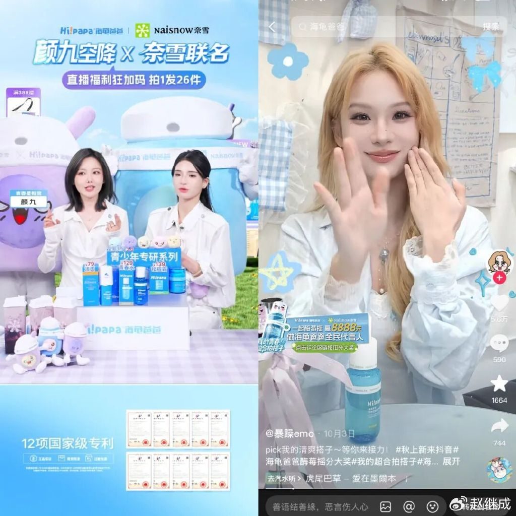 母婴品牌海龟爸爸也深谙多元渠道整合之道,在国庆及双11蓄水期精准发力,围绕青少年专研护肤品打造高效传播矩阵。其敏锐洞察亲子出行场景,跨界联名茶饮品牌奈雪,借国庆出游热度植入产品种草,还以手势舞为记忆点打造 #我的青春超合拍搭子 话题,激发用户互动;同时线下落地快闪活动,邀请生活类、美妆类达人担任 “一日店长”,实现线上线下场景联动。