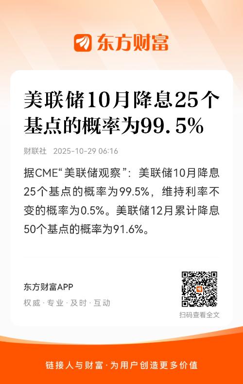 据CME“美联储观察”:美联储10月降息25个基点的概率为99.5%,维持利率不变的概率为0.5%。美联储12月累计降息50个基点的概率为91.6%。