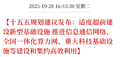 A股盘后传来重磅消息!规划终于发布!“构建现代化基础设施体系”成为核心亮点。规划明确提出“适度超前建设新型基础设施”,重点推进信息通信网络、全国一体化算力网、重大科技基础设施三大领域建设。