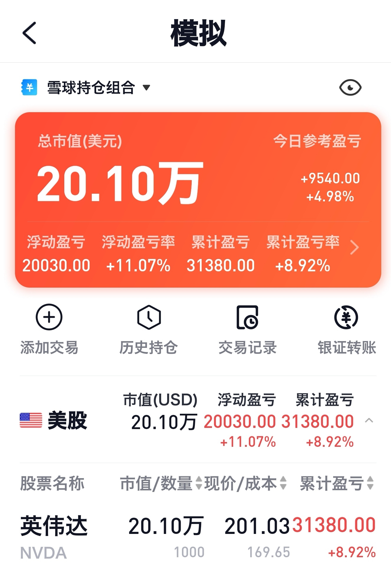 今天收盘突破了200美元,比我预期的晚了28天,我买的不是英伟达的模拟盘,买的是