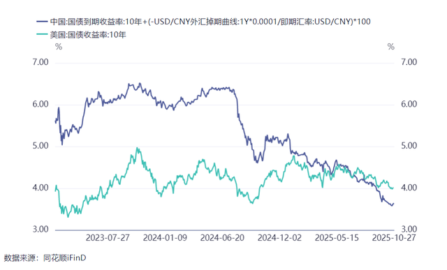 我们看看“10年中债利率+掉期点补贴”和10年美债利率对比图。