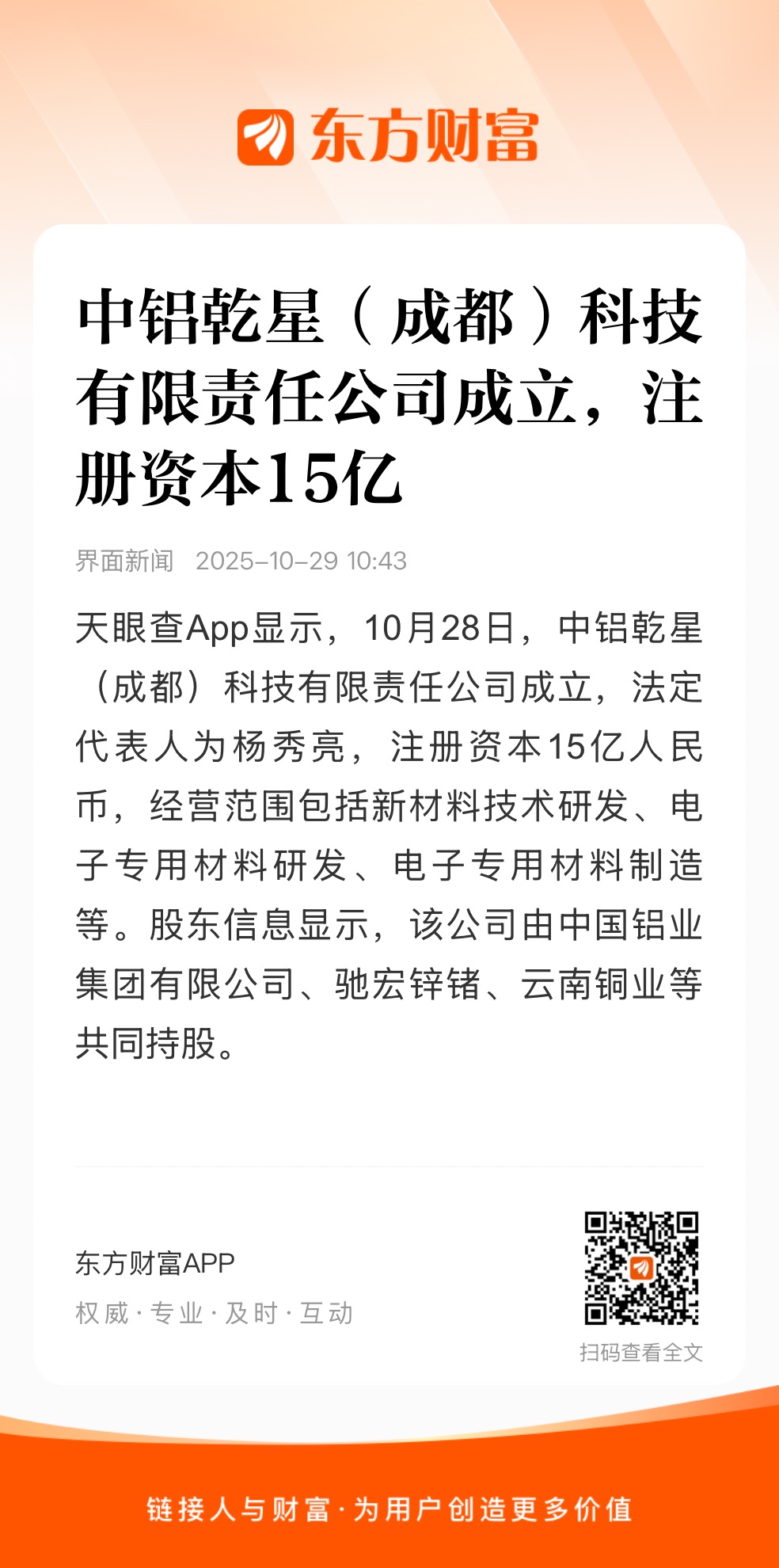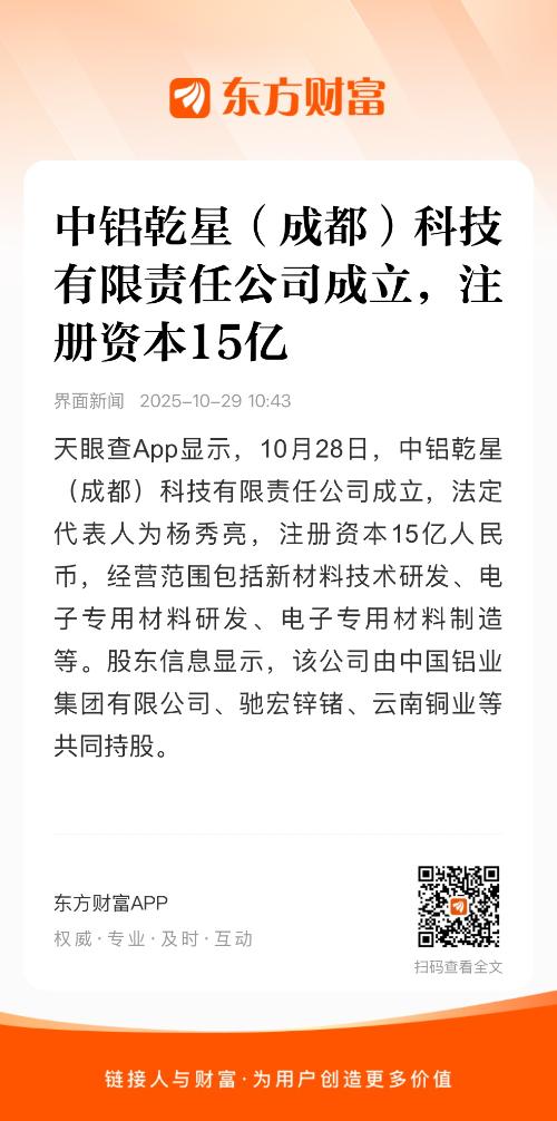 天眼查App显示,10月28日,中铝乾星(成都)科技有限责任公司成立,法定代表人为杨秀亮,注册资本15亿人民币,经营范围包括新材料技术研发、电子专用材料研发、电子专用材料制造等。股东信息显示,该公司由中国铝业集团有限公司、驰宏锌锗、云南铜业等共同持股。