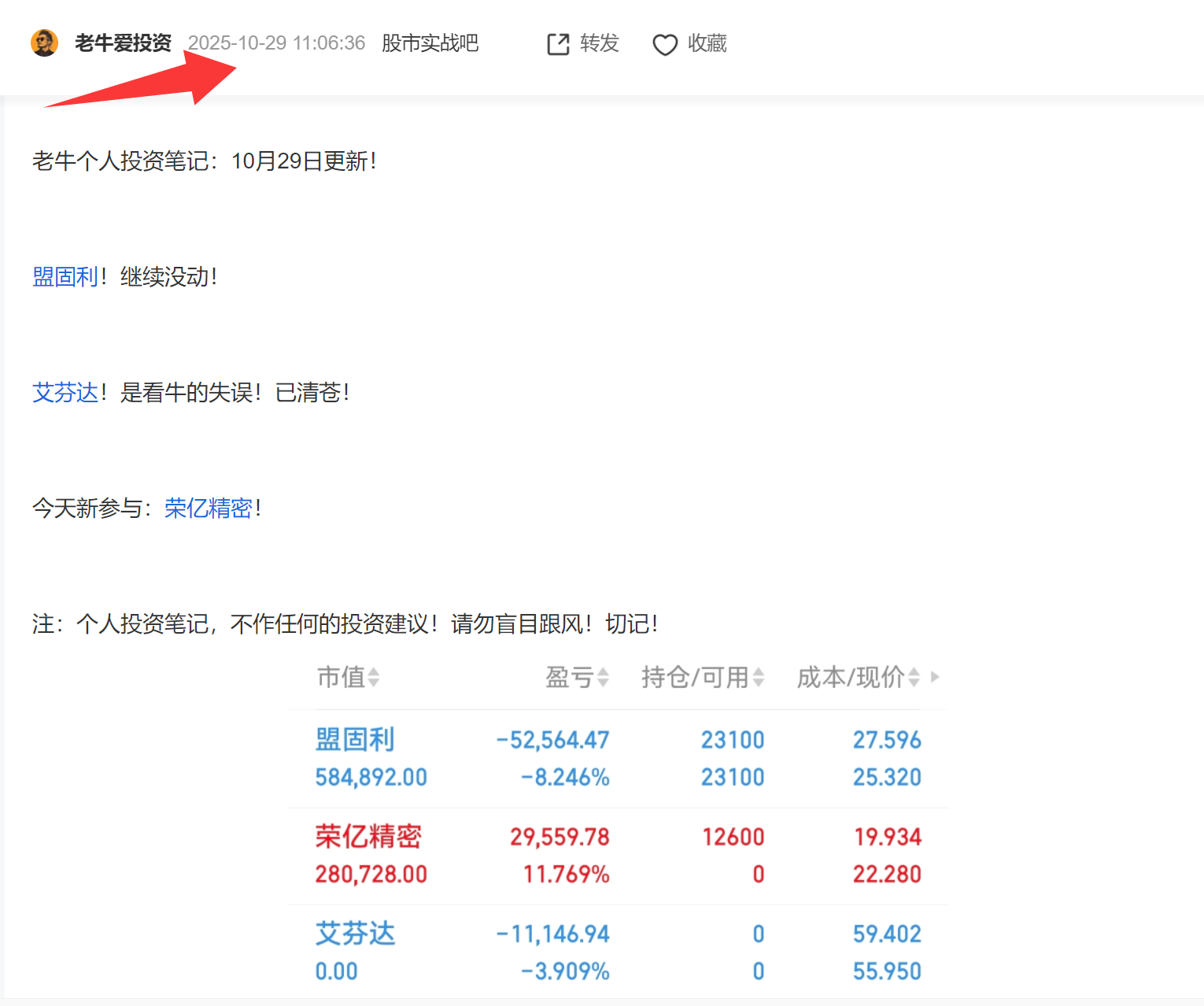 今天的内容怎么没显示?老牛个人投资笔记:10月29日更新!盟固利!继续没动!艾芬