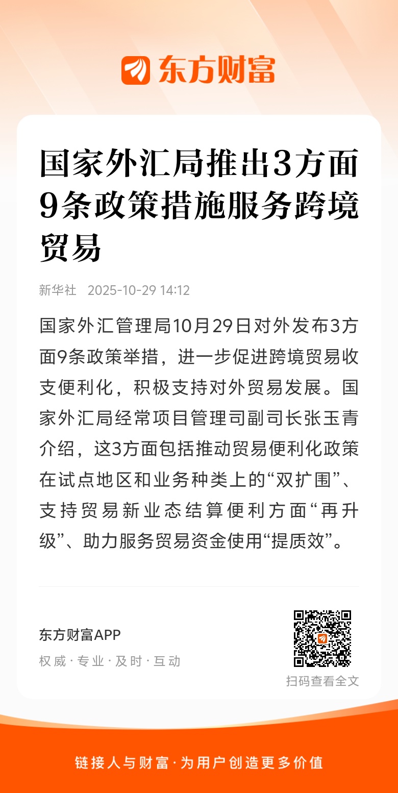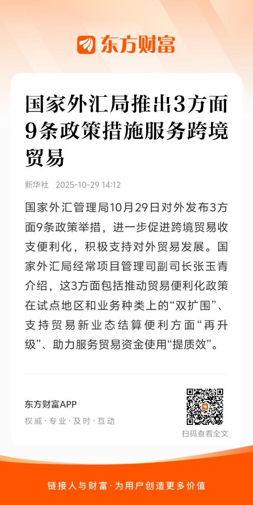 国家外汇管理局10月29日对外发布3方面9条政策举措,进一步促进跨境贸易收支便利化,积极支持对外贸易发展。