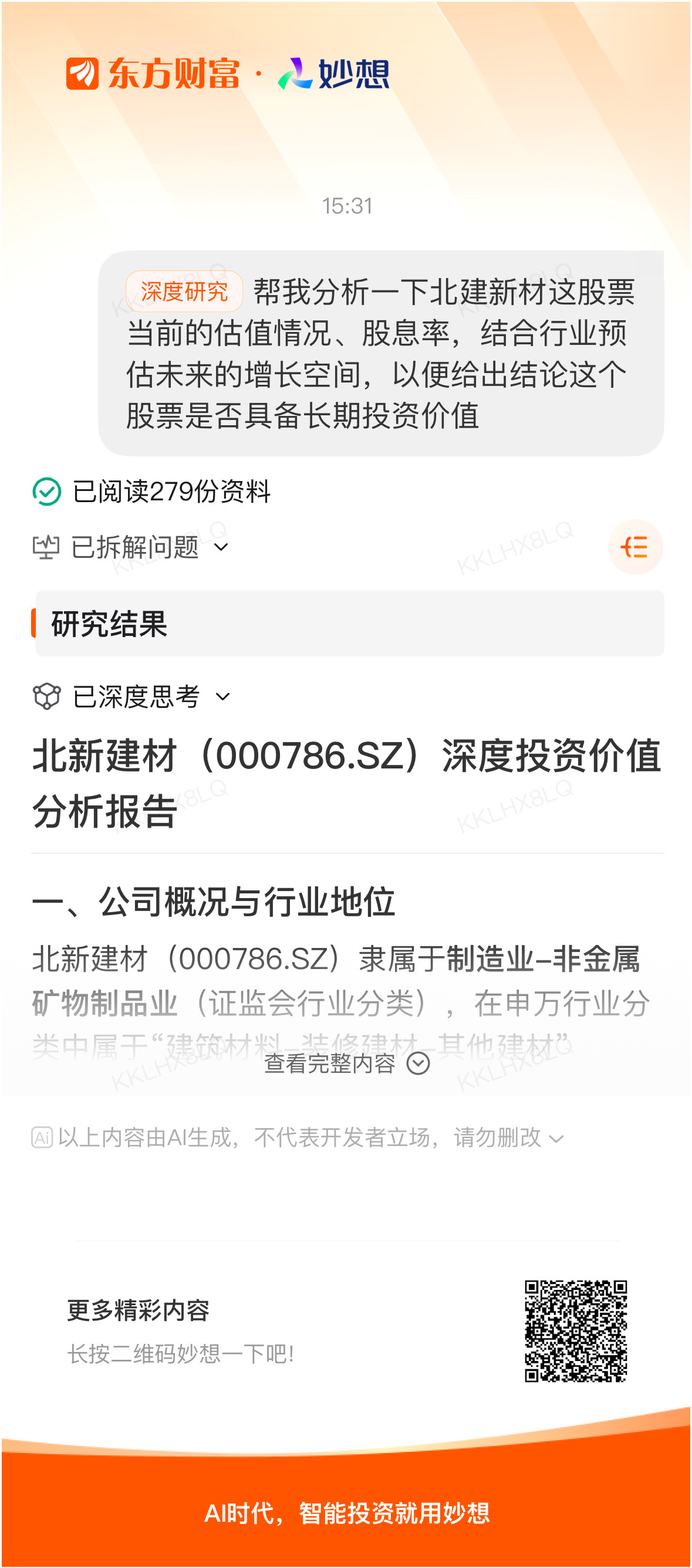 妙想一下:帮我分析一下北建新材这股票当前的估值情况、股息率,结合行业预估未来的增